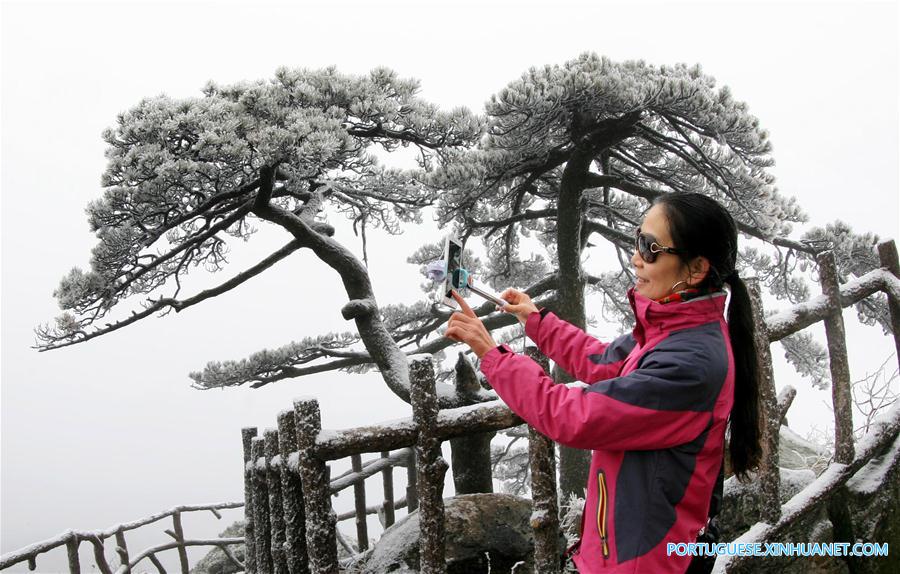 Uma turista observa a paisagem nevada da montanha Huangshan, na ciadade de Huangshan, na província de Anhui, no leste da China, em 23 de novembro de 2016. (Xinhua/Shi Guangde)