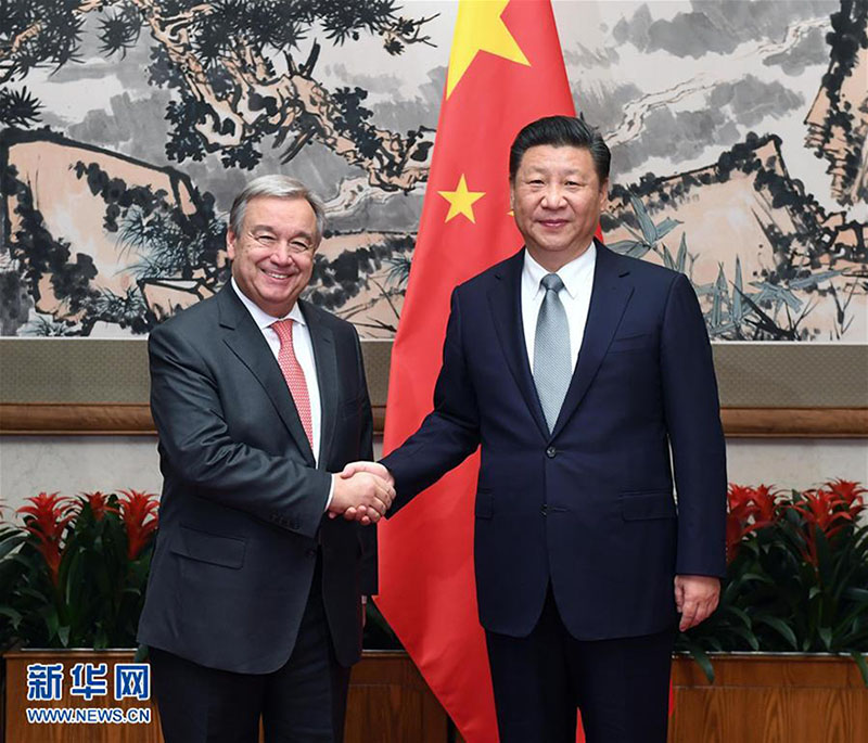 Xi Jinping cumprimenta o futuro secretário-geral da ONU, António Guterres.