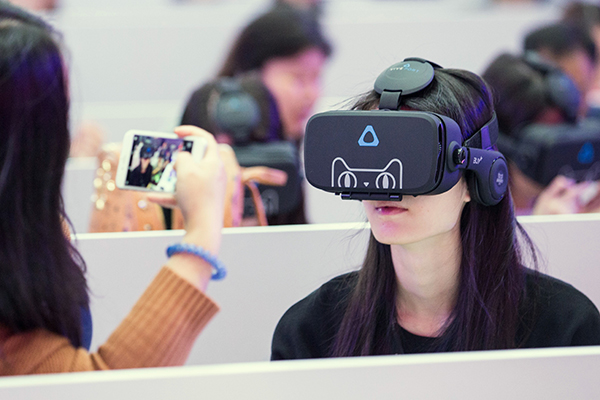 Mulher experimenta a realidade virtual do Alibaba, durante uma feira em Shenzhen, província de Guangdong