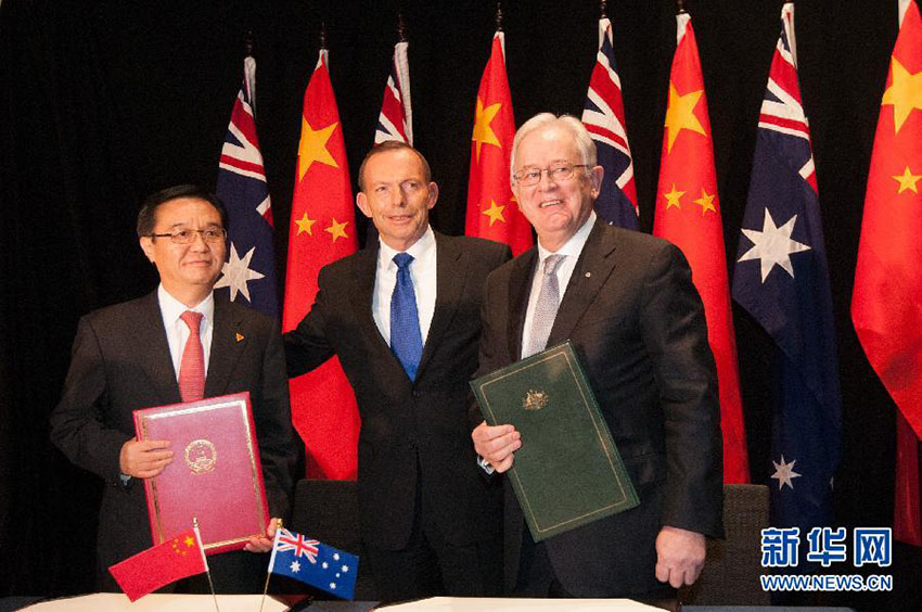 O ministro chinês do Comércio, Gao Hucheng (esquerda) e o ministro australiano de Negócios, Andrew Robb (direita), posam para a foto com o primeiro-ministro australiano, Tony Abbott, depois de assinarem o Acordo de Livre Comércio China-Austrália, na Galeria Nacional em Canberra, a 17 de junho de 2015.