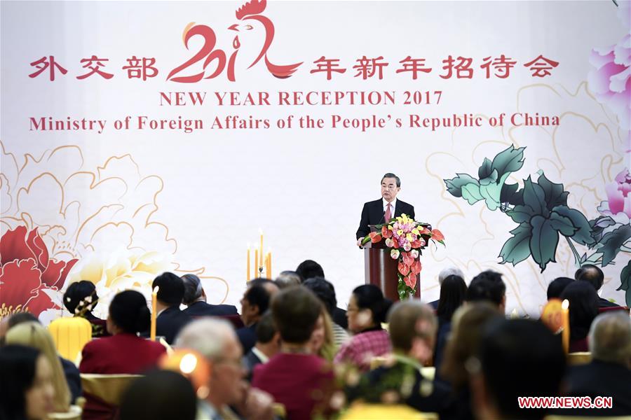 O ministro das Rela??es Exteriores da China, Wang Yi, pronuncia um discurso durante uma recep??o do Ano Novo Chinês, realizada pelo Ministério das Rela??es Exteriores da China para diplomatas estrangeiros e representantes de organiza??es internacionais em Beijing, capital da China, em 24 de janeiro de 2017. (Xinhua/Zhang Ling)