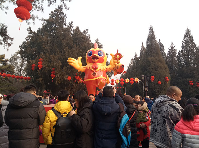 Após termos batalhado até ao guiché da bilheteira e dado entrada no parque que circunda o templo, pudemos, dentro do possível, apreciar a multiplicidade de adere?os característicos da quadra festiva que decoravam cada recanto, incluindo um galo gigante que anunciava a chegada do ano daquele animal do zodíaco chinês (já falamos em lanternas vermelhas? Sim! Est?o em todo o lado!).