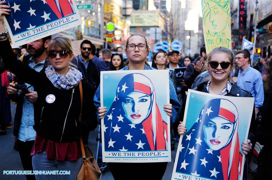 Nova York, 21 fev (Xinhua) -- Cerca de 1000 nova-iorquinos reuniram-se na Times Square, apelidada de "Encruzilhada do Mundo" no domingo, para mostrar solidariedade com a comunidade mu?ulmana de Nova York, em protesto contra a política de imigra??o do presidente dos EUA, Donald Trump.