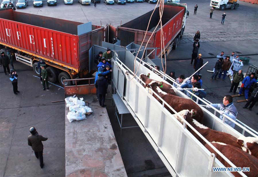 JINAN, 21 fev (Xinhua) -- Um total de 1.195 cabe?as de gado chegou na segunda-feira à Província de Shandong, leste da China, o primeiro lote de gado importado transportado pelo mar ao país.