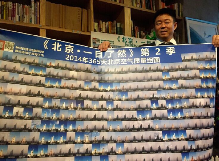 Zou Yi apresenta aos meios de comunica??o as fotografias que capturou dos céus de Beijing ao longo do ano de 2014.