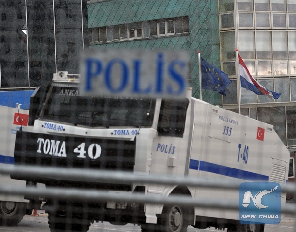 Veículo da polícia turca é avistado à porta da Embaixada da Holanda em Ankara. Cerca de 200 pessoas, com a bandeira turca, se reuniram em frete à embaixada holandesa para protestar contra a proibi??o imposta aos políticos turcos, pela Holanda, de participarem no referendo constitucional.
