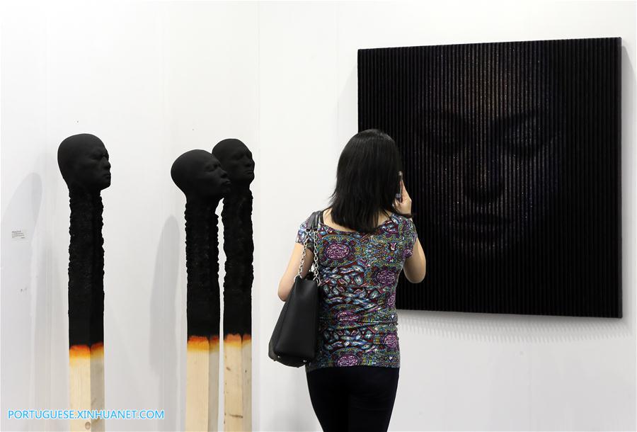 Pessoas visitam a exposi??o "Art Central" em Harbourfront, Hong Kong, no sul da China, em 21 de mar?o de 2017. A "Art Central" 2017 come?ou na ter?a-feira e terá 5 dias de dura??o. A mostra conta com pe?as de 100 galerias de todo o mundo e cria??es de vários artistas. (Xinhua/Li Peng)
