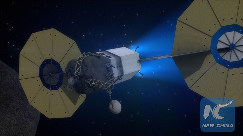 Imagem modelada divulgada pela agência espacial norte-americana NASA mostra uma nave espacial capturando um fragmento de um asteroide. A NASA anunciou no dia 25 de mar?o de 2015 ter decidido proceder à captura de um fragmento de um asteroide maior, ao invés de mover um asteroide menor para a sua ambiciosa Miss?o de Redireccionamento de Asteroide (ARM, na sigla em inglês) que verificará as capacidades necessárias para futuras expedi??es humanas a Marte.