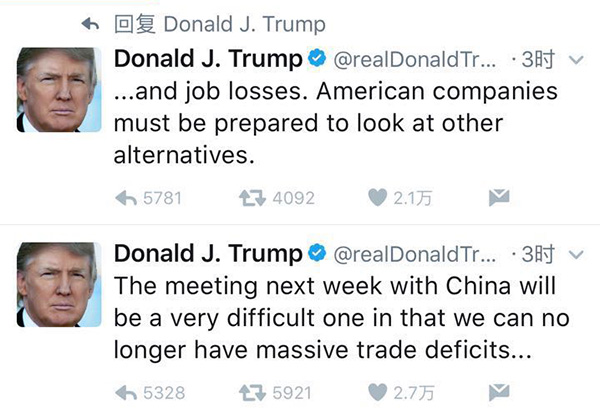 “O encontro na próxima semana com a China será difícil pois n?o podemos mais ter défices comerciais em massa...e perdas de empregos,” escreveu Trump. “As empresas norte-americanas têm de estar preparadas para outras alternativas.”