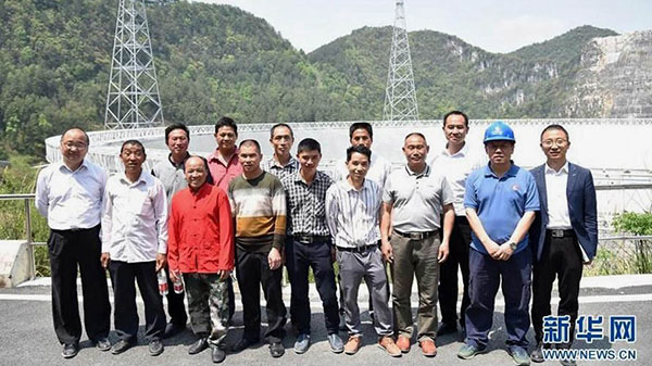 Peng Bo (segundo da direita), gerente adjunto do projeto FAST, posa com ex-residentes de Dawodang e outros funcionários.