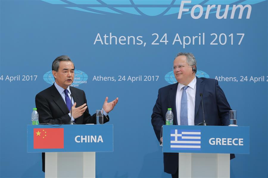 O ministro das Rela??es Exteriores da China, Wang Yi, juntamente com o seu homólogo grego Nikos Kotzias, participa do encontro ministerial do Fórum das Civiliza??es Antigas em Atenas, a 24 de abril de 2017.