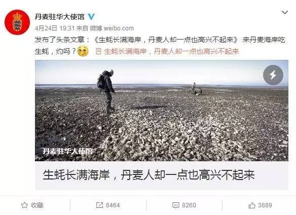Na segunda-feira, a embaixada dinamarquesa em Beijing postou um artigo na sua conta de Weibo, vers?o chinesa do twitter, referindo que as ostras-do-pacífico se têm espalhando por toda a Escandinávia desde 2010, o que constitui uma amea?a severa à condi??o da vida dos animais e plantas que habitam no Mar de Wadden.