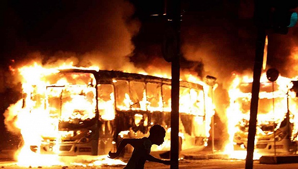 Na referida cidade, pelo menos 8 ?nibus foram incendiados e a polícia de choque foi chamada a intervir com disparos de balas de borracha e gás lacrimogêneo.