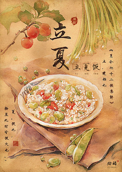 Uma pintura sobre o Início do Ver?o criada por Li Xiaolin. Enquanto artista popular, Li combina hábitos durante o termo solar com as comidas associadas, criando, assim, uma série de ilustra??es intituladas "24 termos solares e delícias chinesas". [Foto oferecida a chinadaily.com.cn]
