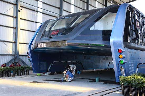 O TEB-1 ?nibus Elevado de Transito em uma esta??o experimental em Qinhuangdao, na província de Hebei.