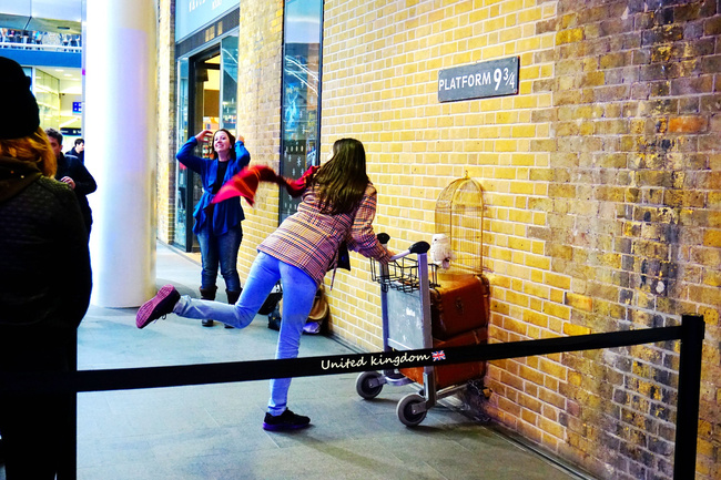 Vários f?s se reuniram em torno da plataforma 9 3/4 na vida real, na esta??o londrina, que figura uma gaiola de coruja e um trolley embutidos na parede.