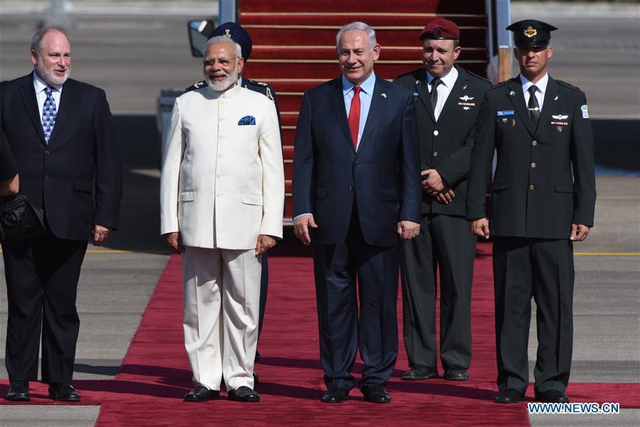 Jerusalém, 6 jul (Xinhua) -- O primeiro-ministro indiano, Narendra Modi, chegou em Israel na ter?a-feira para a primeira visita de um primeiro-ministro indiano ao país, com o objetivo de aumentar os la?os de todos os lados.