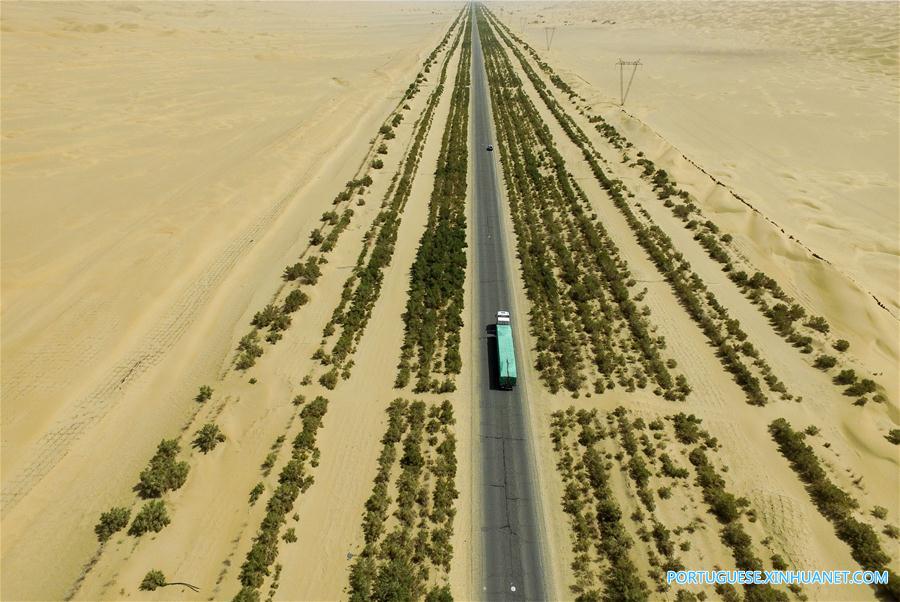 Com 436 km de comprimento e mais de 70 metros de largura, o "muro verde" é formado por cerca de 20 milh?es de árvores e foi concluído em 2005, para proteger a rodovia desértica da invas?o de areia na Regi?o Aut?noma Uygur de Xinjiang, noroeste da China.