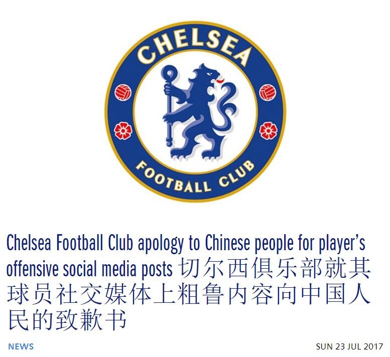O clube inglês Chelsea Football Club apresentou um pedido de desculpas oficial ontem (24) pelas publica??es do jogador brasileiro Kenedy no Instagram, que “ofenderam e magoaram” os f?s chineses.