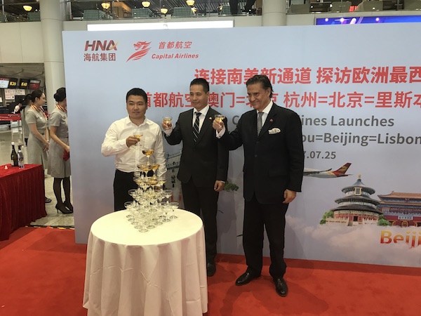 O Terminal T1 do Aeroporto Internacional de Beijing recebeu ontem uma cerimónia organizada pela Capital Airlines, com o intuito de formalizar os primeiros voos com os trajetos “Hangzhou-Beijing-Lisboa” e “Macau-Beijing”, sendo que o último consiste numa solu??o para simplificar a liga??o aérea entre RAEM e a capital portuguesa.