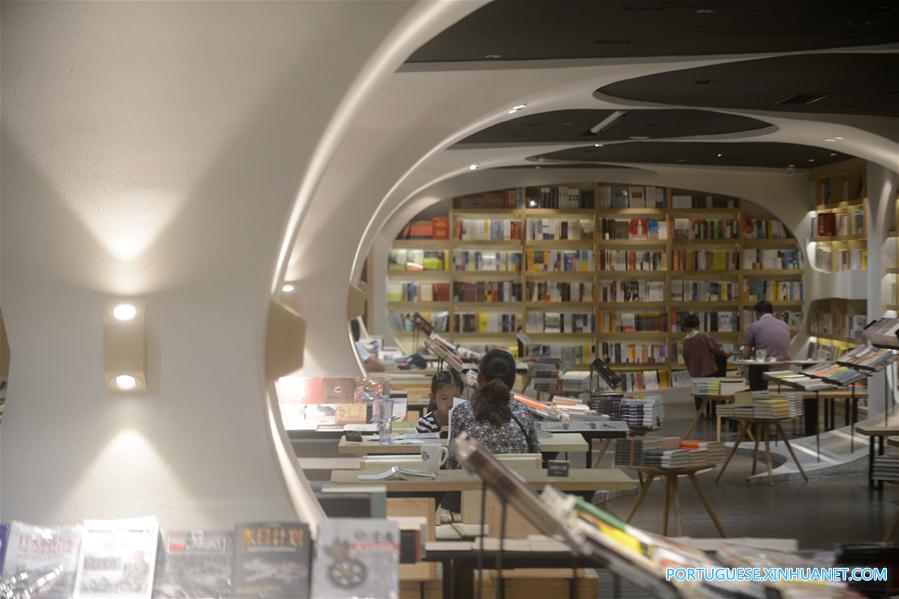 Pessoas leem na livraria Zhongshuge em Yangzhou, província de Jiangsu, no leste da China, em 7 de agosto de 2017. O termo solar "Início do Outono" cai no dia 7 de agosto neste ano. Com a temperatura mais agradável, os residentes de Yangzhou vieram à livraria para ler e comprar livros.