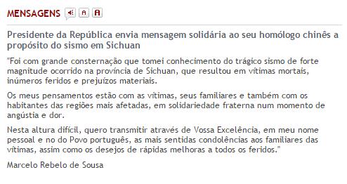 "Foi com grande consterna??o que tomei conhecimento do trágico sismo de forte magnitude ocorrido na província de Sichuan, que resultou em vítimas mortais, inúmeros feridos e prejuízos materiais”, pode ler-se na mensagem, publicada no website da presidência da república.