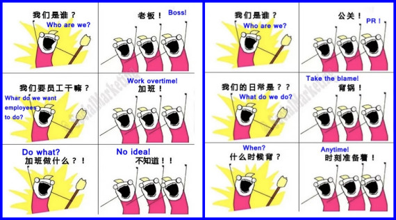 O aplicativo mais famoso de mensagens instantaneas da China, o WeChat, foi inundado com o meme “Quem somos/O que queremos”, geralmente associado a comportamentos laborais e a práticas de consumo na China.