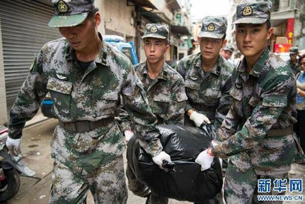 A pedido do governo da RAEM e sob a aprova??o do governo central de acordo com a Lei Básica da RAEM e a Lei de Guarni??o da RAEM, as tropas foram mobilizadas em 25 de agosto para o alívio de desastre e voltaram à guarni??o em 28 de agosto, segundo Ren.