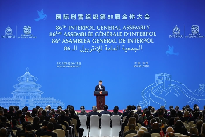 O presidente Xi Jinping discursa na cerim?nia de abertura da 86a Assembleia Geral da Interpol, no Centro Nacional de Conven??es de Beijing, a 26 de setembro de 2017.