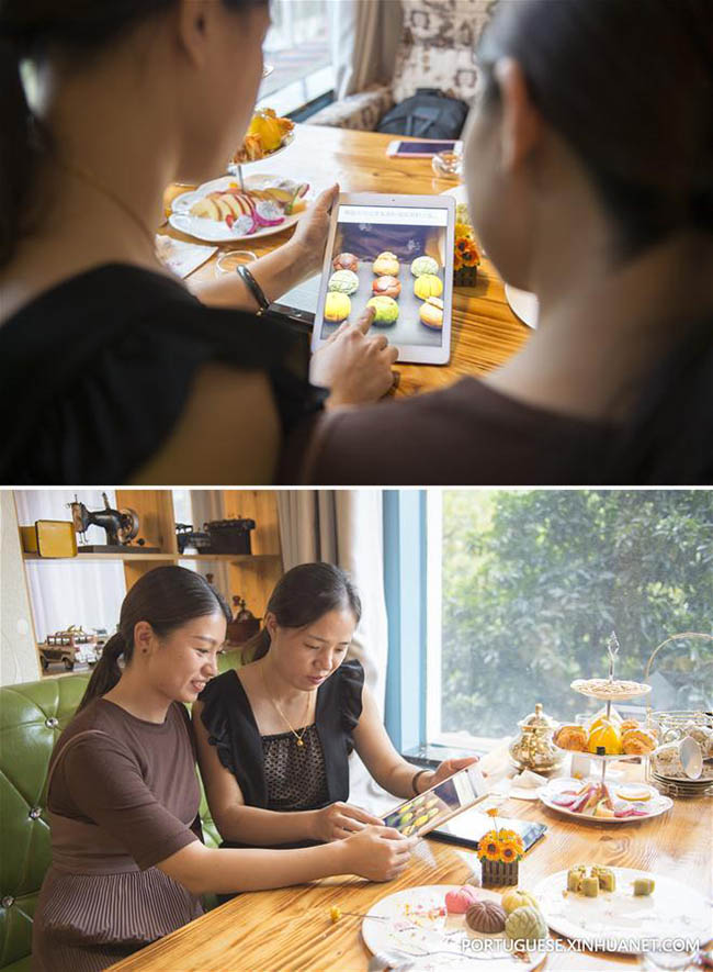| A padeira Zhan Fei (e, acima) e sua cliente conversam sobre o design de bolinhos da lua em uma padaria no distrito de Yushan, província de Jiangxi, no leste da China, em 22 de setembro de 2017. |