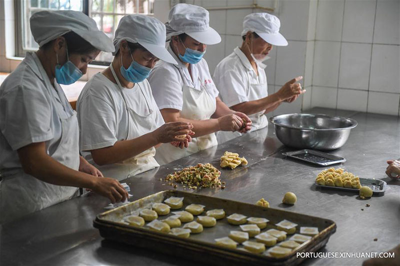 | Padeiros fazem bolinhos da lua em uma padaria na antiga cidade de Tangqi em Hangzhou, capital da província de Zhejiang, no leste da China, em 29 de setembro de 2017. |