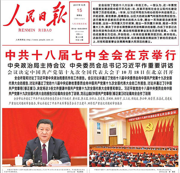 O Diário do Povo, jornal oficial do PCCh, publica reportagem sobre a 7a Sess?o Plenária do 18o Comitê Central do partido, a 15 de outubro de 2017. Doze ex-funcionários governamentais foram expulsos do partido.