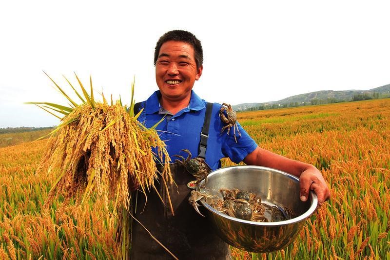 Agricultores em Shaanxi desfrutam da esta??o de dupla colheita de arroz e caranguejos.