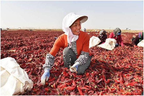 Agricultores de Xinjiang secam piment?es de pigmento. O pigmento destes piment?es deboa qualidade,conseguido gra?as aos recursos naturais do local, é utilizado em batons de marcas internacionais. Segundo os residentes, o rendimento do piment?o está estimado entre 1500 a 2000 de yuans por mu (cerca de 0.07 hectar).