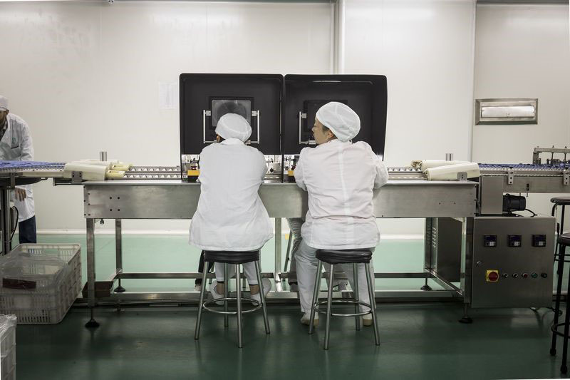 Funcionárias examinam medicamentos na linha de produ??o na fábrica farmacêutica Baiyunshan da Corpora??o Farmacêutica de Guangzhou.