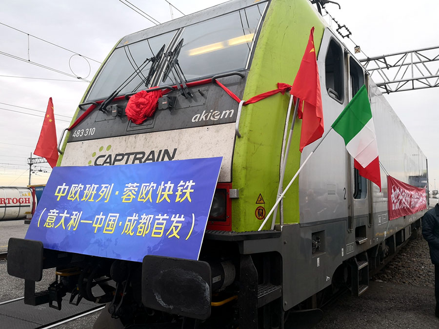 Um trem partiu na manh? de ter?a-feira (horário local) da segunda maior cidade italiana e chegará a Chengdu depois de uma viagem de 10.694 quil?metros em 14 dias, disse o governo do distrito de Qingbaijiang, de Chengdu.