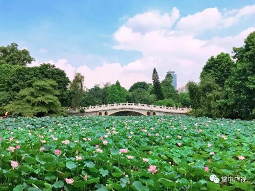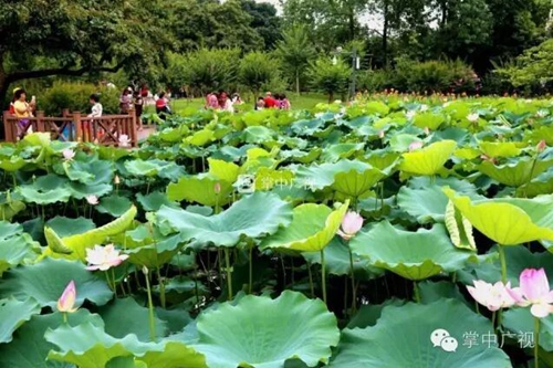 Turistas encantados pelas flores de lotus no Parque do Lago Liuhua