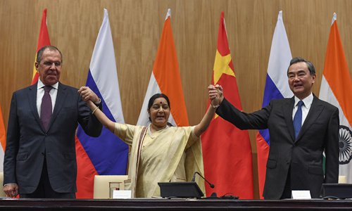 Sushma Swa-raj, ministra da índia, recebeu o ministro Wang Yi, da China, e o ministro russo Sergey Lavrov, em um encontro onde foram também discutidos o comércio e a seguran?a regional.