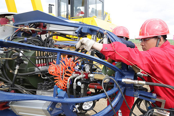 Um funcionário inspeciona o equipamento de soldagem para a constru??o do gasoduto Rússia-China East-Route, em Heihe, província de Heilongjiang, a 29 de junho de 2015.
