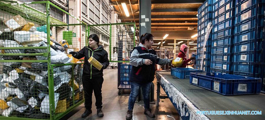 Funcionárias classificam remessas da China em um centro postal em Santiago, Chile, em 25 de agosto de 2017.