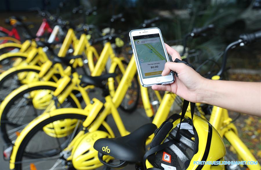 Uma usuária mostra o aplicativo da ofo após usar bicicleta da ofo em Sydney, Austrália, em 26 de outubro de 2017.