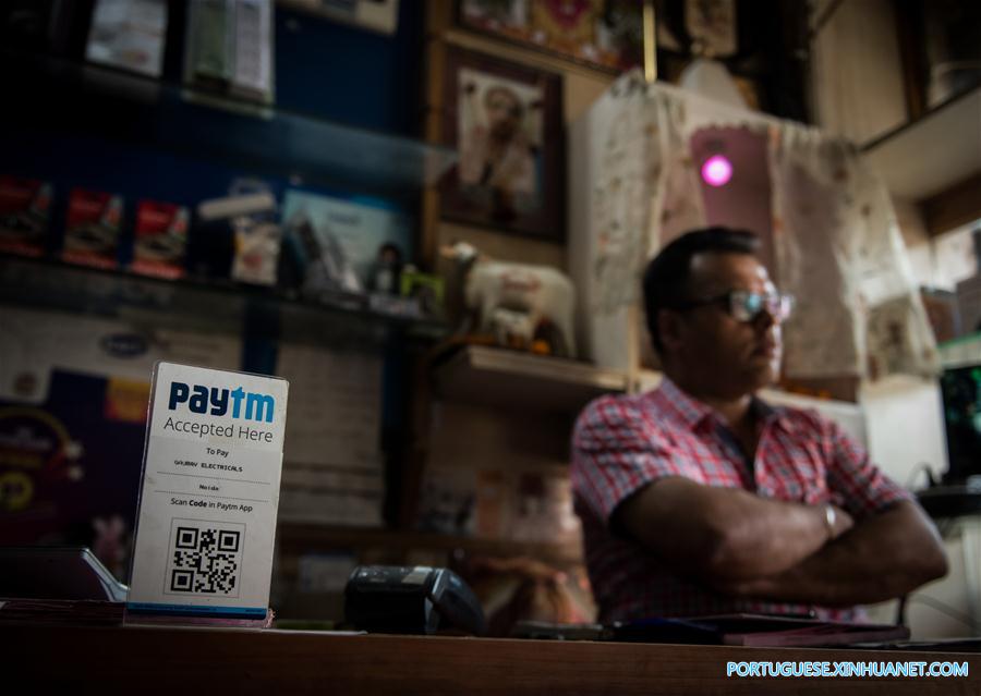Um proprietário de uma loja recebe pagamentos com o Paytm, uma marca de pagamento eletr?nico patrocinada pela Ant Financial da China, em Nova Déli, índia, em 12 de abril de 2017.