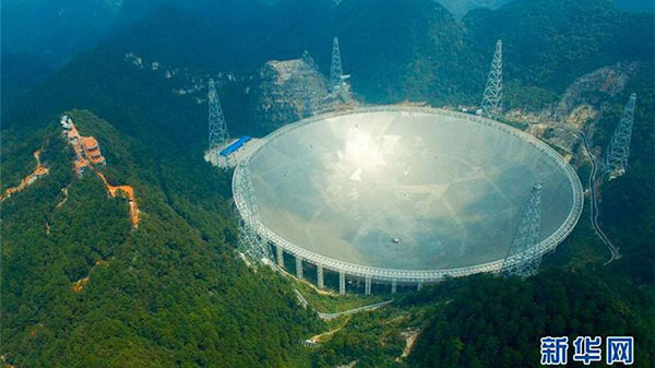Construído em setembro de 2016, o FAST é o maior radiotelescópio de prato único do mundo, estando localizado em uma depress?o cárstica de forma??o natural na província de Guizhou, no sudoeste da China.
