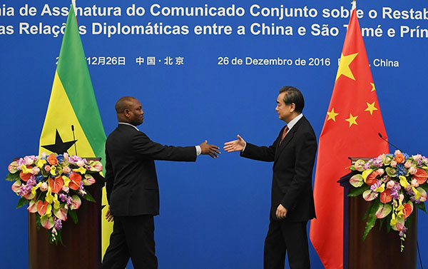 Wang Yi, e o seu homólogo s?o tomense, Urbino Potelho, em Beijing, a 26 de dezembro de 2016.