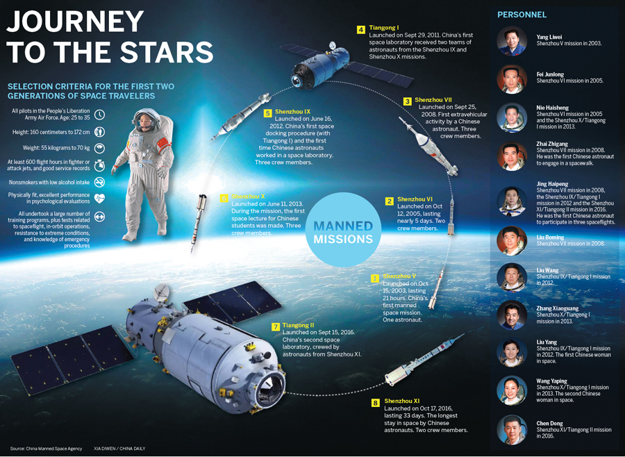 "As miss?es para a esta??o espacial durar?o muito mais tempo do que as miss?es anteriores. Os sistemas da esta??o ser?o mais avan?ados e sofisticados do que os da série espacial Shenzhou e os laboratórios espaciais Tiangong, de um modo que exijam um maior conhecimento, habilidade e perícia dos astronautas", disse Fei Junlong, enviado para o espa?o a bordo do Shenzhou VI em 2005.