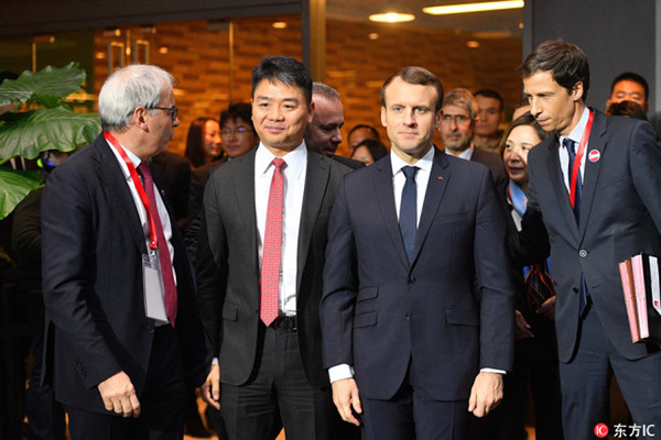O presidente francês Emmanuel Macron posa para uma foto com o CEO da JD.com, Richard Liu Qiangdong, durante uma reuni?o com líderes empresariais na incubadora de start-up, Soho3Q, em Beijing, a 9 de janeiro de 2018.