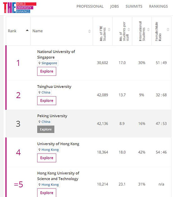Entre todas as 350 universidades na lista, cinco das 10 melhores s?o da parte continental da China e Hong Kong. A Universidade Tsinghua está no segundo lugar, depois da Universidade Nacional de Cingapura. A Universidade de Pequim está no terceiro lugar, seguida pela Universidade de Hong Kong e Universidade de Ciência e Tecnologia de Hong Kong.