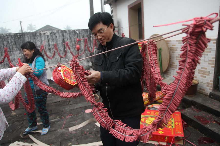 Na Véspera do Ano Novo, o maior evento é o jantar de reuni?o familiar anual. No norte da China, é habitual fazer jiaozi (ravioli chinês) com membros da família para comer ao redor da meia-noite. No sul, porém, as pessoas gostam de fazer niangao (bolo de arroz do Ano Novo) e enviar alguns para parentes e amigos como presentes.