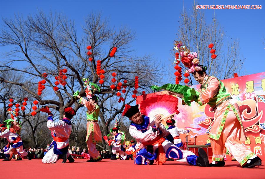 Artistas se apresentam durante uma feira de templo em Beijing, em 16 de fevereiro de 2018. As pessoas realizam várias atividades para celebrar o Ano Novo Lunar chinês em toda a China. (Xinhua/Luo Xiaoguang)