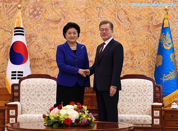 Seul, 27 fev (Xinhua) -- Liu Yandong, enviada especial do presidente chinês Xi Jinping, se reuniu na segunda-feira com o presidente sul-coreano Moon Jae-in, pedindo esfor?os para impulsionar la?os consistentes com a inten??o original de ambos os lados ao estabelecer as rela??es diplomáticas.
